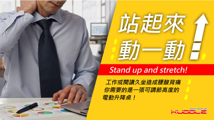 久坐會造成身體代謝變差,影響血液循環,還會因為脂肪堆積造成肥胖,長時間用電腦的上班族因為久坐導致脊椎受力不均造成腰痠背痛更是普遍的職業病。要改善工作久坐的問題最好的方式,是坐一段時間、站一段時間,讓身體多多活動、伸展四肢;選擇一張能升降的桌子是一件重要的事情!※片中提到的更換桌板,以KUDDLE提供之款式為主。※請勿站立或坐在桌上啟動升降功能,以免造成危險。